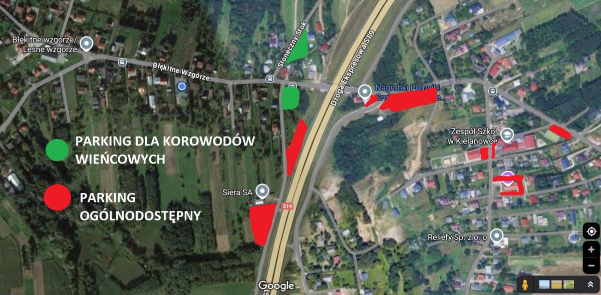 PARKINGI DLA KOROWODÓW WIEŃCOWYCH – wyznaczone specjalne miejsca parkingowe w pobliżu ul. Słoneczny Stok (kolor zielony na mapie).