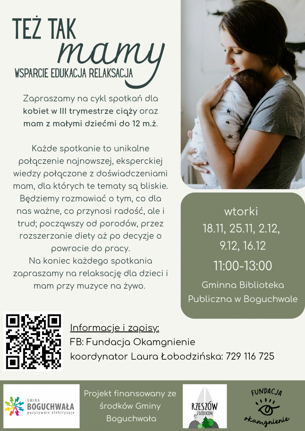 Fundacja Okamgnienie, przy wsparciu Gminy Boguchwała, zaprasza na bezpłatne spotkania dla mam małych dzieci oraz kobiet w III trymestrze ciąży.