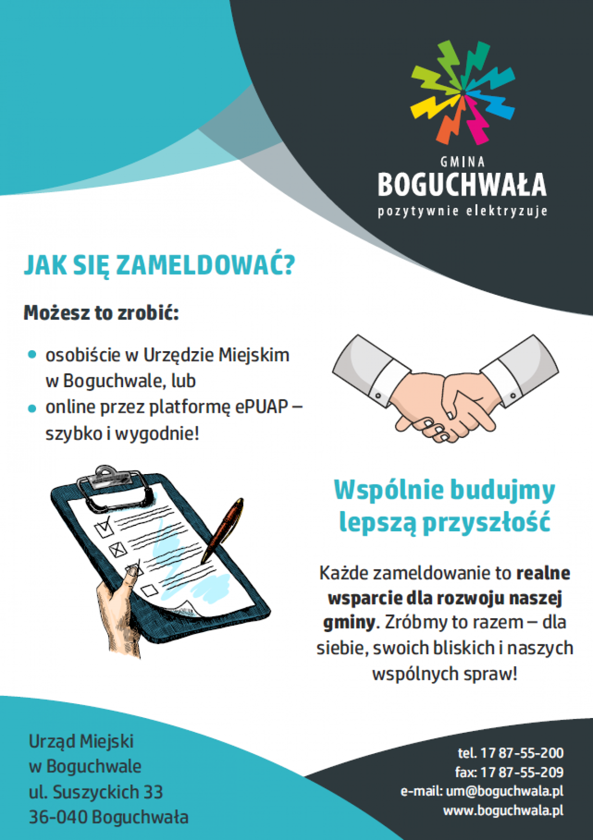Zameldowanie jest możliwe w Urzędzie Miejskim w Boguchwale w godzinach pracy urzędu lub przez ePUAP.