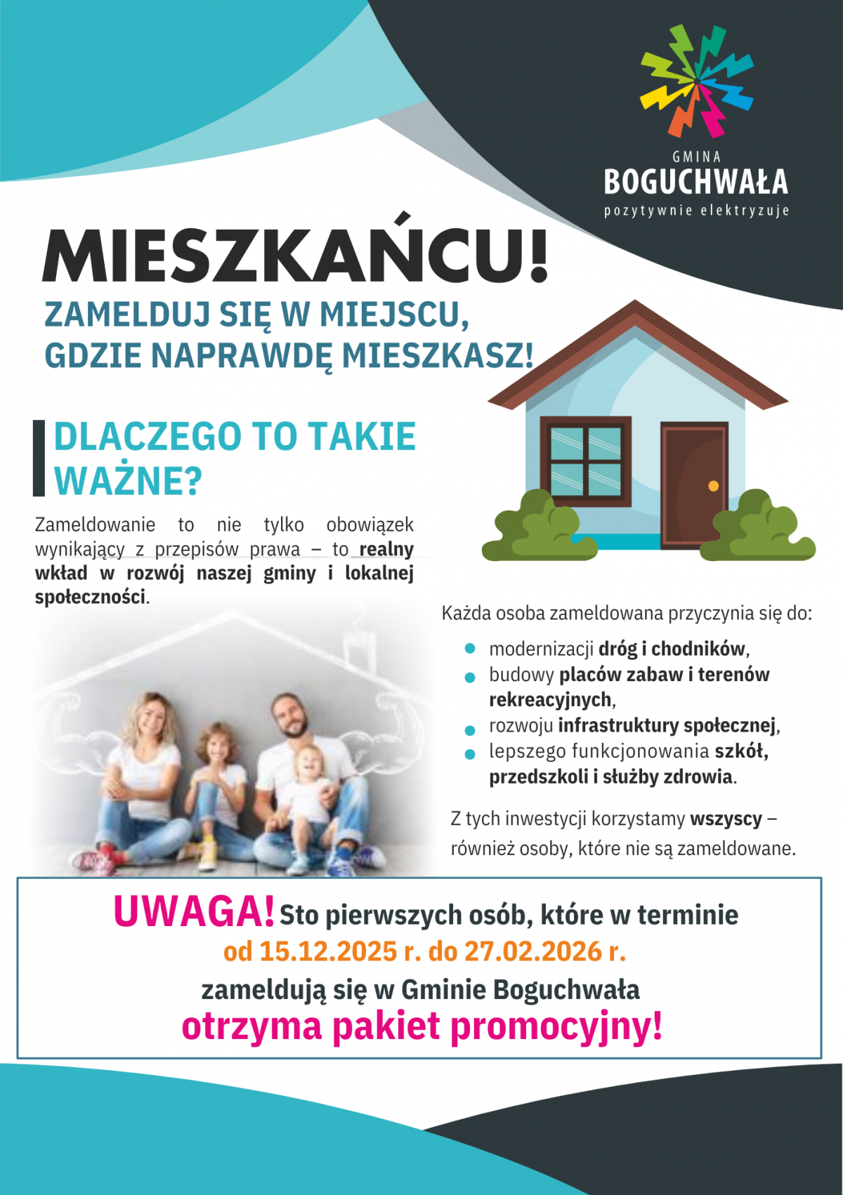 Pierwsze 100 osób, które od 15 grudnia 2025 r. do 27 lutego 2026 r. zameldują się na stały pobyt w Gminie Boguchwała, otrzyma wyjątkowy pakiet prezentowy do wyboru: