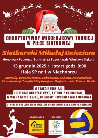 Serdecznie zapraszamy na Charytatywny Mikołajkowy Turniej w Piłce Siatkowej "Siatkarski Mikołaj Dzieciom" pod patronatem Burmistrza Boguchwały Wiesława Kąkola.