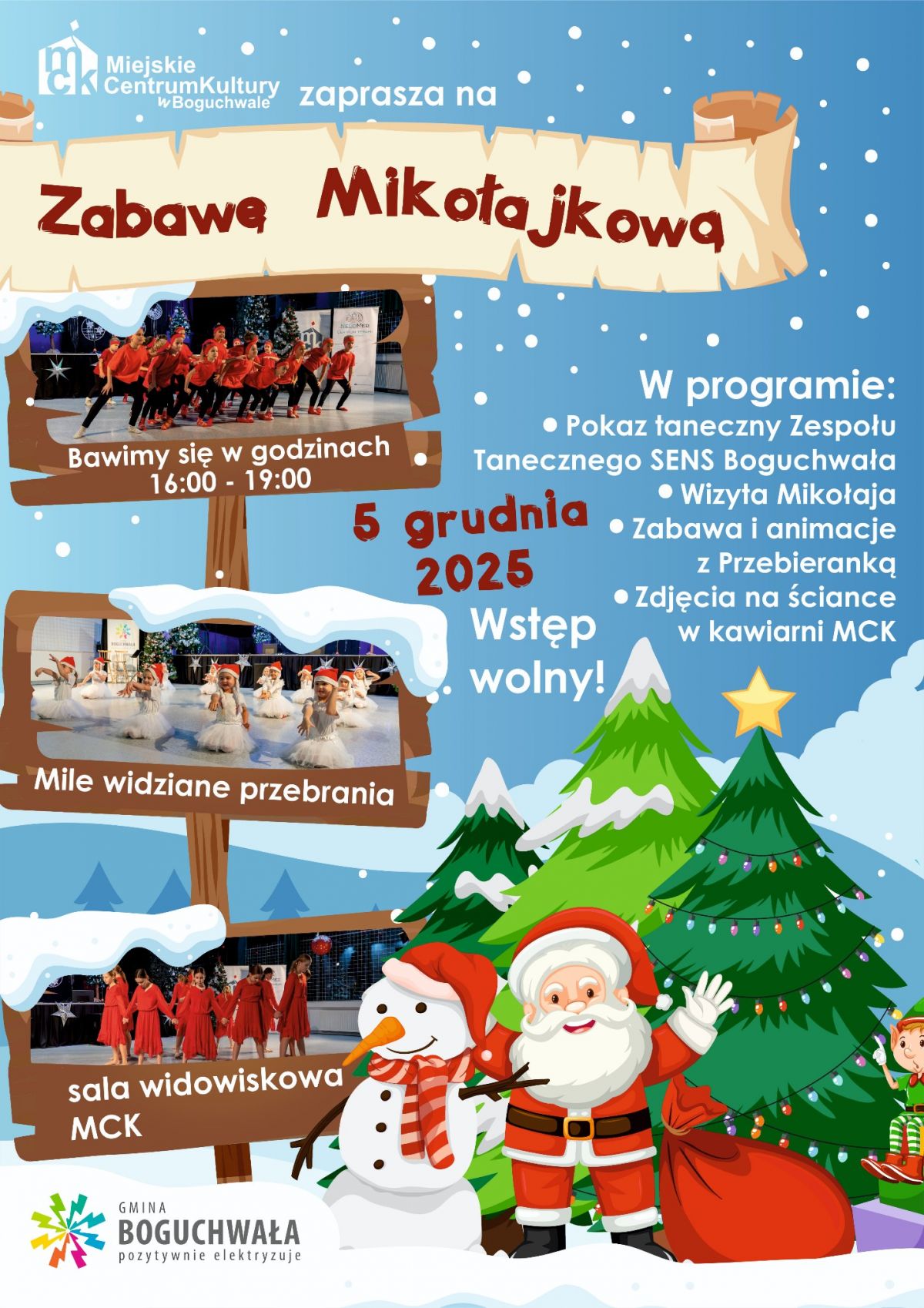 Miejskie Centrum Kultury w Boguchwale zaprasza na Zabawę Mikołajkową w dniu 5 grudnia 2025 w sali widowiskowej MCK Boguchwała
