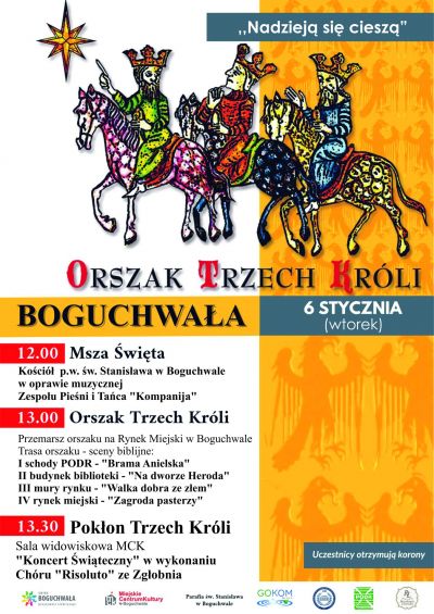 - Barwny pochód wyruszy sprzed kościoła około godz.13.00 i przejdzie, przemierzając trasę i sceny biblijne do sali widowiskowej Miejskiego Centrum Kultury w Boguchwale, gdzie odbędzie się Pokłon Trzech Króli i Koncert Świąteczny w wykonaniu Chóru "Risoluto" ze Zgłobnia.