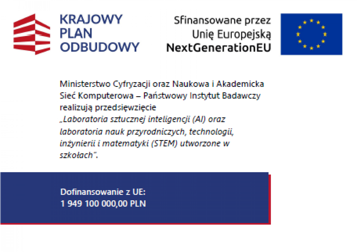 w odpowiednie urządzenia i infrastrukturę ICT w celu poprawy ogólnej wydajności systemów edukacji, wskaźnik C13L Laboratoria sztucznej inteligencji (AI) oraz laboratoria nauk przyrodniczych, technologii, inżynierii i matematyki (STEM) utworzone w szkołach”.